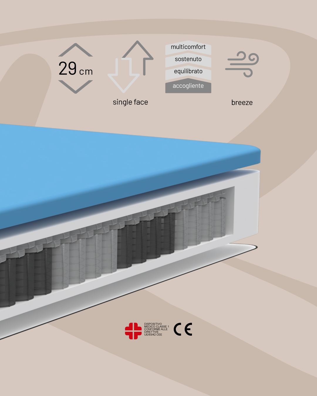 - Die Rinaldi-Matratzen – wie das Modell SIRIUS – sind als medizinisches Produkt Klasse 1 nach EU-Verordnung 2017/745 (MDR) zertifiziert. Diese Einstufung bedeutet, dass die Matratzen zur Förderung der Gesundheit und Linderung von Beschwerden geeignet sind – z. B. bei Rückenproblemen, orthopädischen Anforderungen oder zur Druckentlastung.